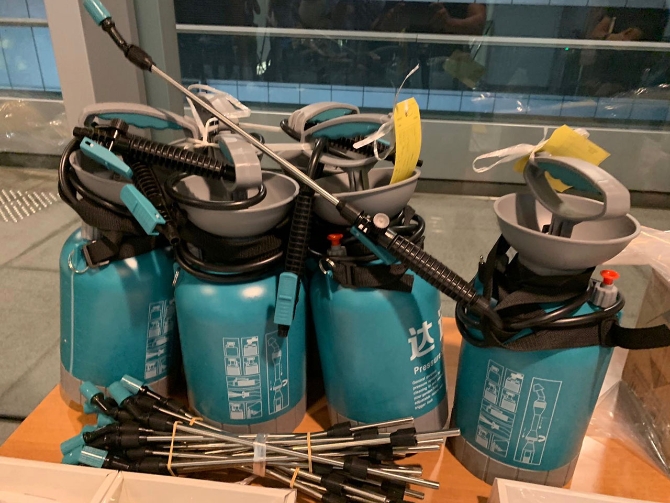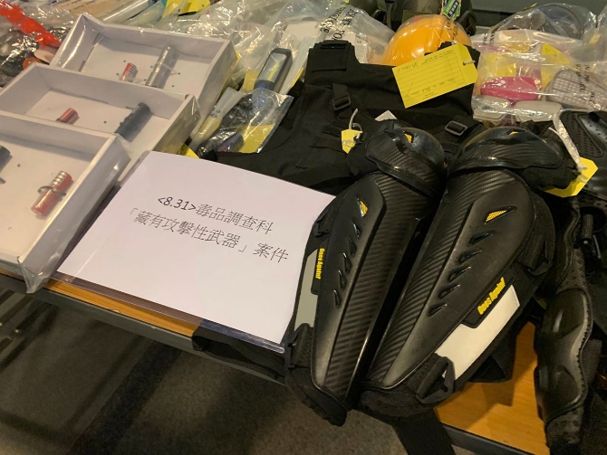 另外,警方在西环也拘捕六男两女共8人,年龄介于19至35岁,检获通渠水、喷漆、油漆、斧头、电动棒球发射器,还有大量假记者证。