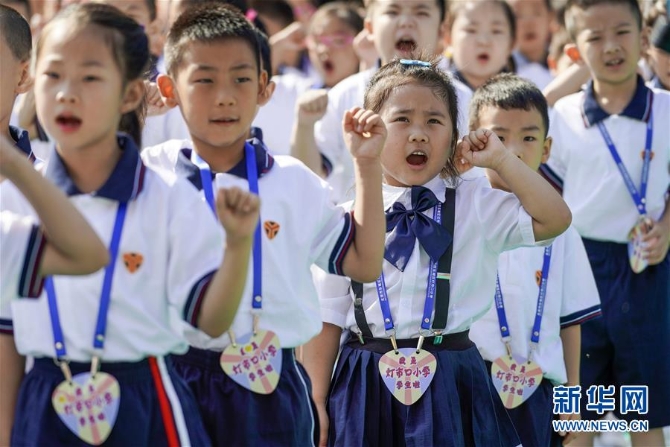 9月1日,在北京市东城区灯市口小学灯市口校区的开学典礼上,一年级新生在进行入学宣誓。新华社 记者沈伯韩摄