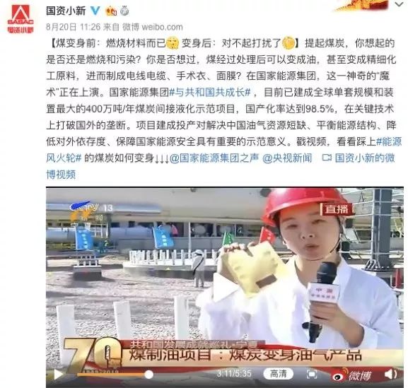 8月20日,小新在微博上发了这样一条微博,介绍煤的“变身”:除了燃烧以外,煤还能制成油,以及一些精细化工原料,这其中就包括面膜的原材料。