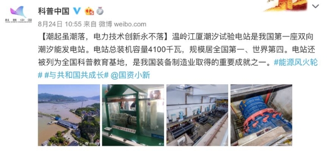温岭江厦潮汐试验电站总装机容量4100千瓦,是目前我国最大、世界第四的潮汐能发电站。该电站的投产发电还作为发生在20世纪的世纪性大事,被镌刻在北京中华世纪坛的青铜甬道铭文中,备受瞩目。