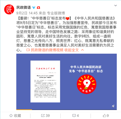 《中华人民共和国慈善法》将每年的9月5日确定为“中华慈善日”,近日,民政部发布“中华慈善日”标志。