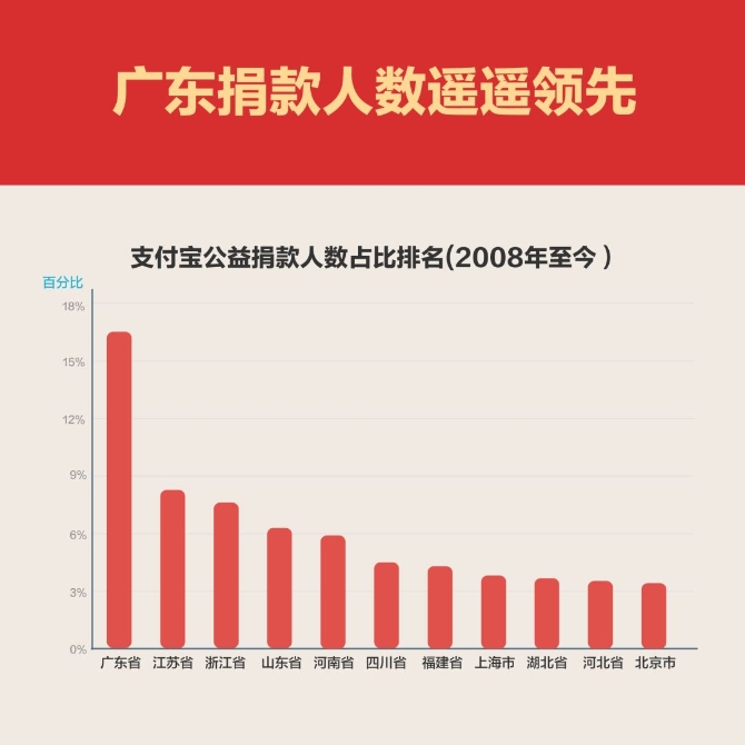从地区来看,广东捐款人数遥遥领先,其次是江苏和浙江。