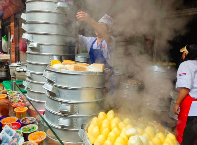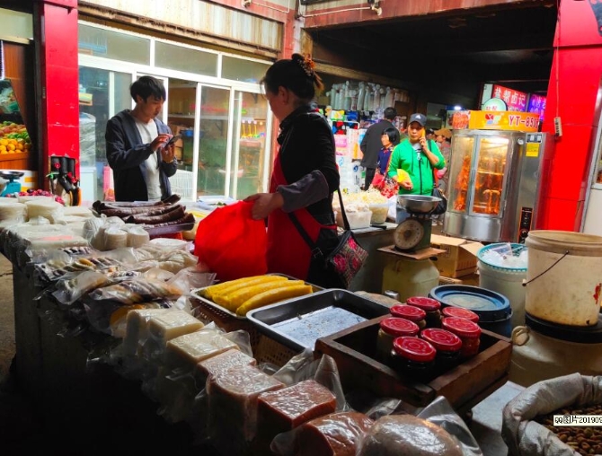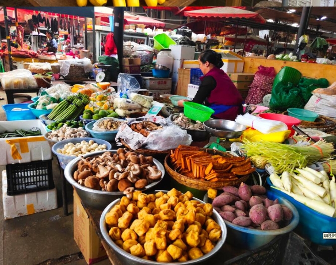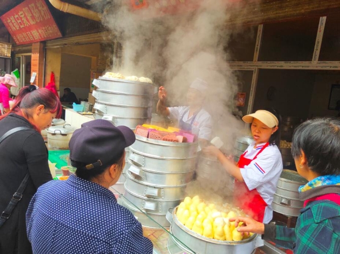 每天清晨,香格里拉最先热闹起来的是隐藏在各个街角的早市,卖早餐的、卖水果的、卖干货的……勤劳的早市生意人在各自的摊位前忙活开了。这边,一笼刚出锅的包子正冒着热气,烟雾笼罩下早有人等在跟前儿递上钱,急着吃上热乎的早餐;那里,卖牛肉的小伙儿正细心地切着昨天顾客预定的上好嫩肉,反复上称打量,生怕少斤短两……这里聚集着香格里拉最普通的劳动者,也是香格里拉最具烟火气息的地方。