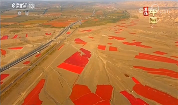 您现在看到的是位于天山北麓的新疆沙湾县安集海镇,是新疆辣椒的主要产区之一,充足的阳光加上天山雪水的灌溉,造就了当地辣椒的品质和口碑。