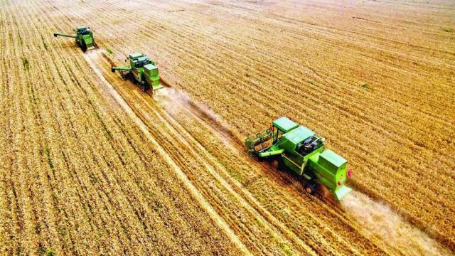 2016年6月13日,联合收割机在河北省邢台市开发区留村镇麦田里收获小麦。(新华社图)