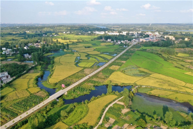 这是信阳市光山县文殊乡东岳村附近的稻田美景(9月4日无人机拍摄)。新华社记者 冯大鹏 摄