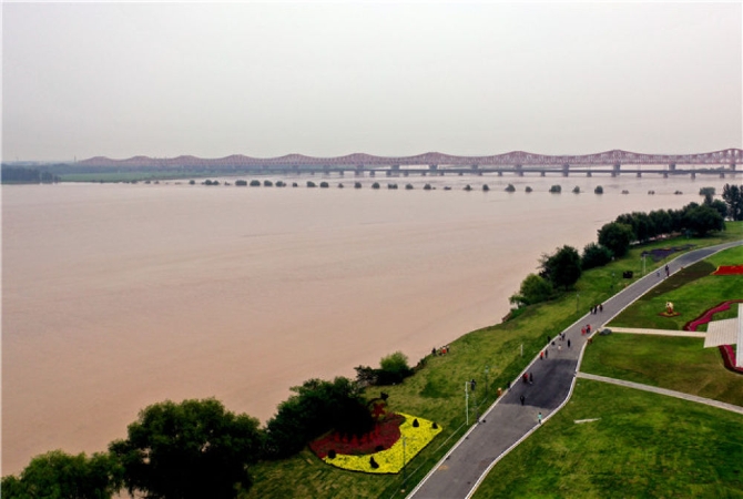 离开黄河博物馆,习近平总书记乘车来到黄河国家地质公园,沿黄河岸边步行察看,登上临河广场观景平台,眺望黄河郑州段。天高水阔,林草丰茂,一片勃勃生机。