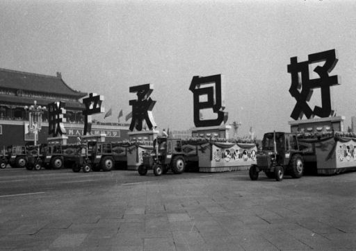 △ 1984年10月1日,国庆35周年庆典的游行彩车打出“联产承包好”的标语。