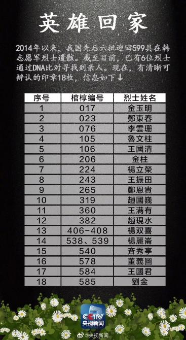 2014年以来,国家以最高礼仪迎回599位中国人民志愿军烈士。这些英烈中很多都没有确认身份姓名。为此,我们联合退役军人事务部及多家媒体,在今年清明节期间共同发起“寻找英雄”大型媒体行动,通过烈士遗骸遗物为他们寻找亲人。现已确定陈曾吉、方洪有、侯永信、冉绪碧、许玉忠、周少武6名烈士的身份和亲缘关系。