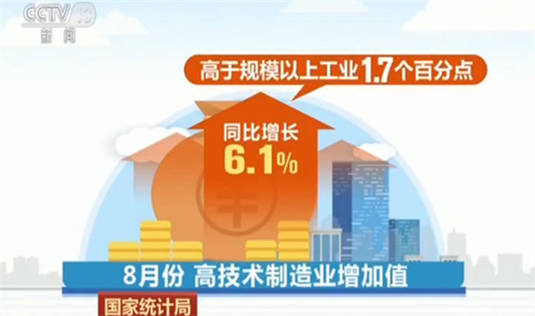 国家统计局近日发布的数据显示,8月份,高技术制造业增加值同比增长6.1%,高于规模以上工业1.7个百分点;占规模以上工业的比重为14.1%,比上月提升0.4个百分点。