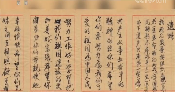 遗嘱表示:我的一生革命南征北战,为国为民鞠躬尽瘁,战斗了一生,没有留下遗产。我把一生为共产主义事业奋斗的精神留给你们,希望你们要努力为我们可爱的祖国,为我们中国人民努力工作,好好学习,把我们祖国建设得更加美好富强。