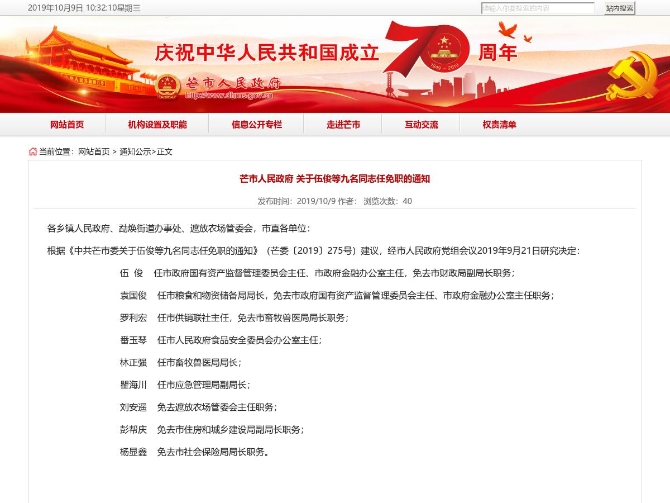 根据《中共芒市委关于伍俊等九名同志任免职的通知》(芒委〔2019〕275号)建议,经市人民政府党组会议2019年9月21日研究决定: