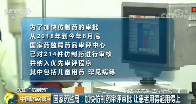 为了加快仿制药的审批,从2018年到今年8月底,国家药监局药品审评中心已对214件仿制药进行审核并纳入优先审评程序,其中包括儿童用药、罕见病等。