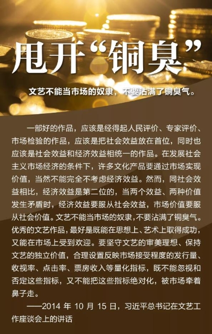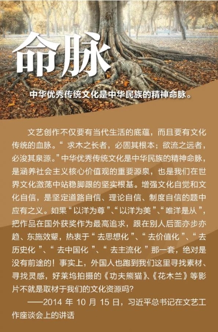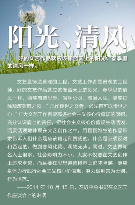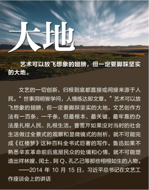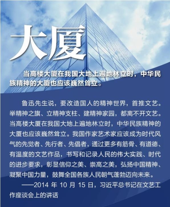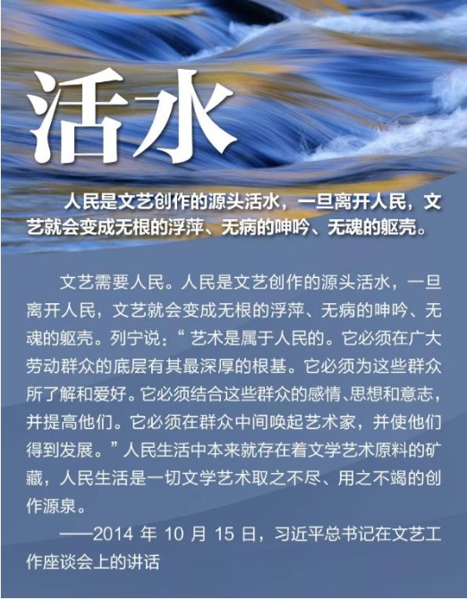 2014年10月15日,习近平主持召开文艺工作座谈会并发表重要讲话。谈及我国文艺繁荣发展的5个问题,强调实现中华民族伟大复兴需要中华文化繁荣兴盛,创作无愧于时代的优秀作品,坚持以人民为中心的创作导向,中国精神是社会主义文艺的灵魂,加强和改进党对文艺工作的领导 。