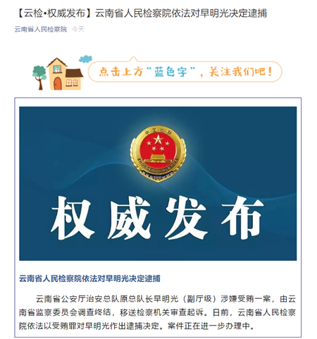 据悉,云南省公安厅治安总队原总队长早明光(副厅级)涉嫌受贿一案,由云南省监察委员会调查终结,移送检察机关审查起诉。日前,云南省人民检察院依法以受贿罪对早明光作出逮捕决定。案件正在进一步办理中。