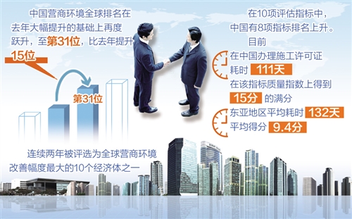 例如,在施工许可证办理方面。目前,在中国办理施工许可证耗时111天,在该指标质量指数上得到15分的满分,高于东亚地区132天和9.4分的平均水平。