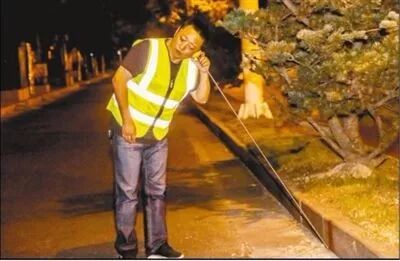 在江苏淮安,“听漏人”在夜间借助听音杆判断地下自来水管是否漏水,确保城市用水安全。王 昊摄(人民视觉)