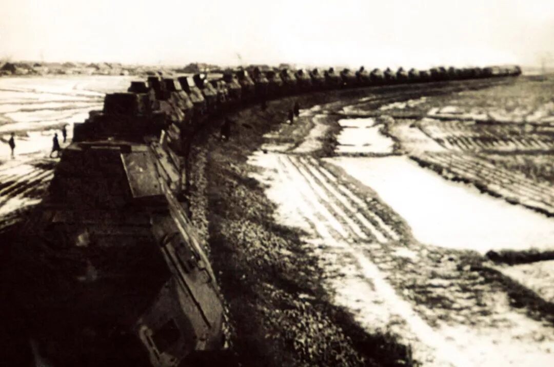 1945年,为了支援解放战争前线,早日获得新中国解放。经过哈尔滨铁路工人们27个昼夜的连续奋战,一台从滨州线肇东车站拉回的机车被成功修复,投入到紧张的铁路运输。