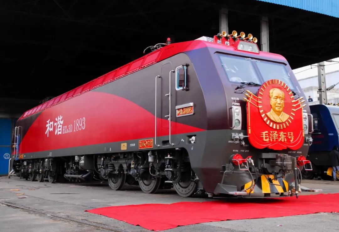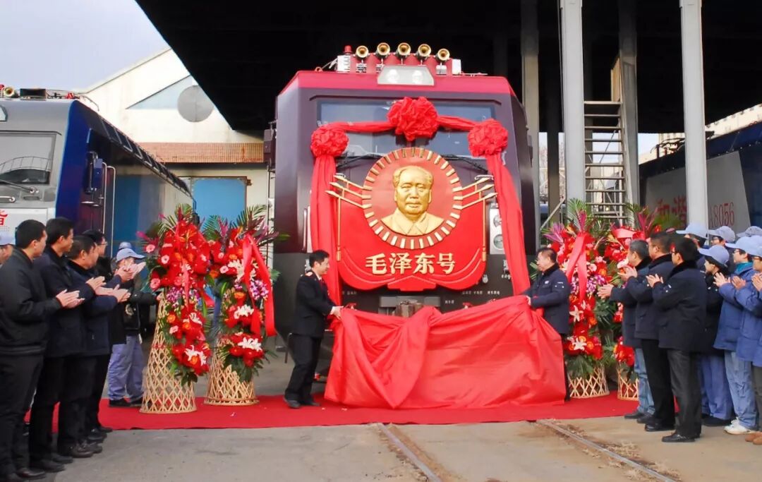 在中国中车大连公司,伴随着清脆的汽笛声和嘹亮的《东方红》乐曲,一台镶嵌毛泽东徽像的“HXD3D1893”机车,缓缓驶出大连机车出车场,交付北京铁路局。这是“毛泽东号”机车的第五次换型。