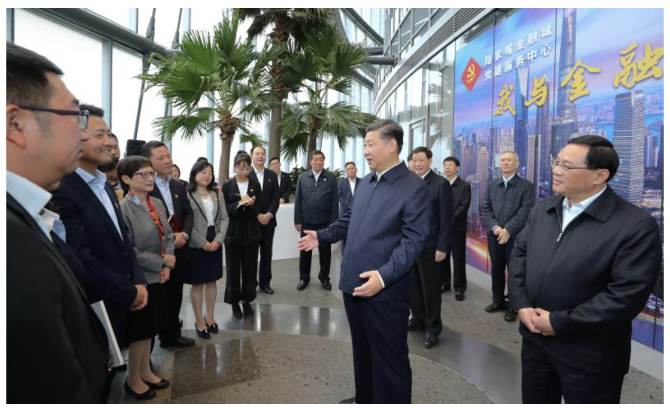 2018年11月6日上午,习近平在上海中心大厦22层的陆家嘴金融城党建服务中心,同正在联合开展主题党日活动的企业党员亲切交谈。