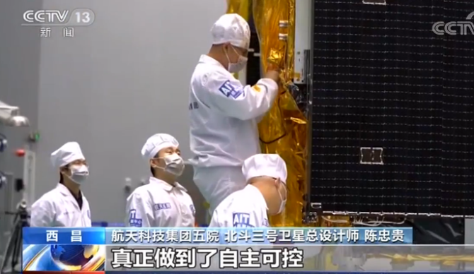 航天科技集团五院 北斗三号卫星总设计师 陈忠贵:我们北斗三号卫星,卫星部组件都是百分之百的是国产,卫星关键的和核心的元器件都是国产的,真正做到了自主可控。卫星具有自主完好性监测功能,这个也是在我国导航卫星上率先使用,具有国际领先水平。