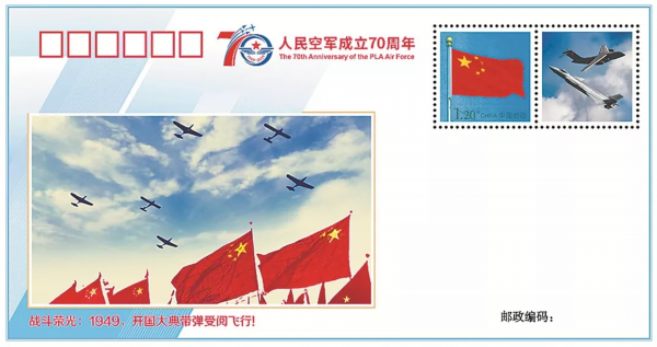 这张照片,是庆祝新中国成立70周年阅兵中领队机梯队的“九机同框”照(郭幸福 摄)。以此“同框照”制作的纪念封,成为人民空军首任司令员刘亚楼夫人翟云英的珍藏之物。