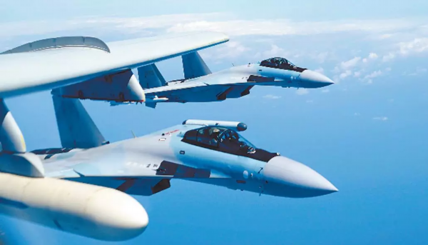 这张照片是苏-35战机与轰-6K战机的“同框照”(刘锐 摄)。2018年5月11日,空军组织东部、南部战区空军协同行动,出动轰炸机、侦察机双向绕飞台岛巡航。苏-35战机首次与轰-6K战机编队飞越巴士海峡,实现了绕岛巡航模式的新突破,彰显了空军体系作战能力的新提升。