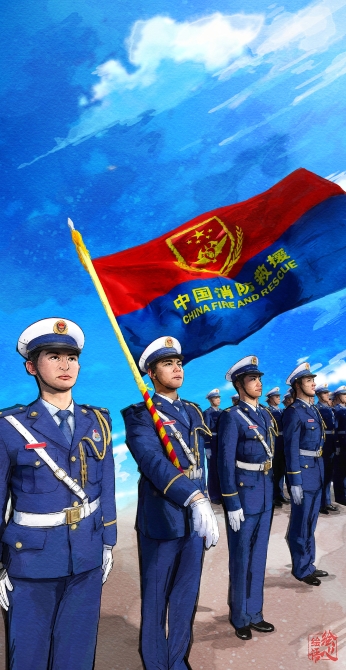 向国家综合性消防救援队伍郑重授旗并致训词