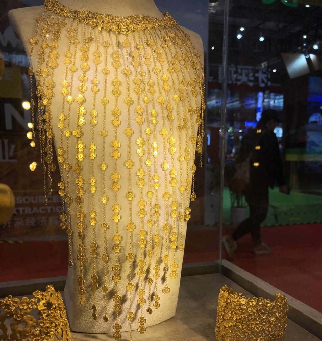 ▲希腊国家馆内的“水果与象征”珠宝展。珠宝设计灵感来源于古希腊钱币上的水果纹饰。新华社记者马晓燕摄