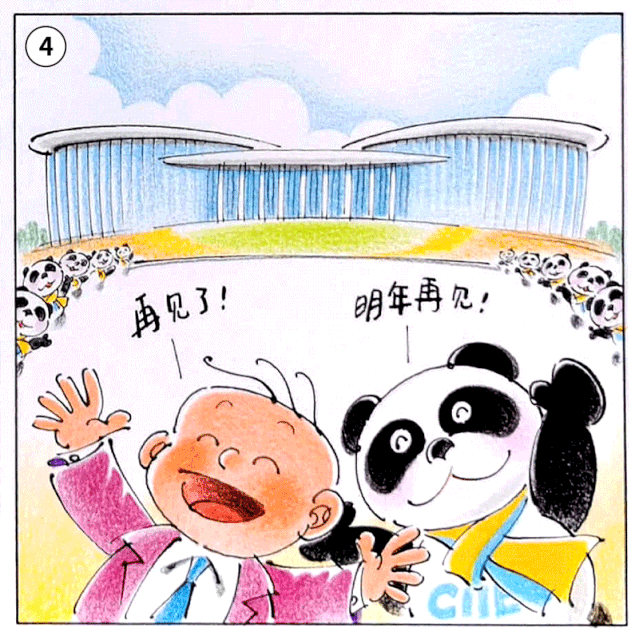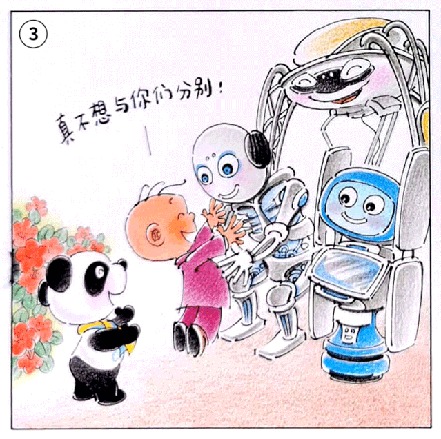 在进博盛会看见未来,三毛不禁感概万千。再一次拥抱迪宝,再一次和进宝握手,三毛有点依依不舍:再见了朋友们,我会想你们的!