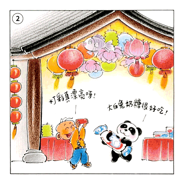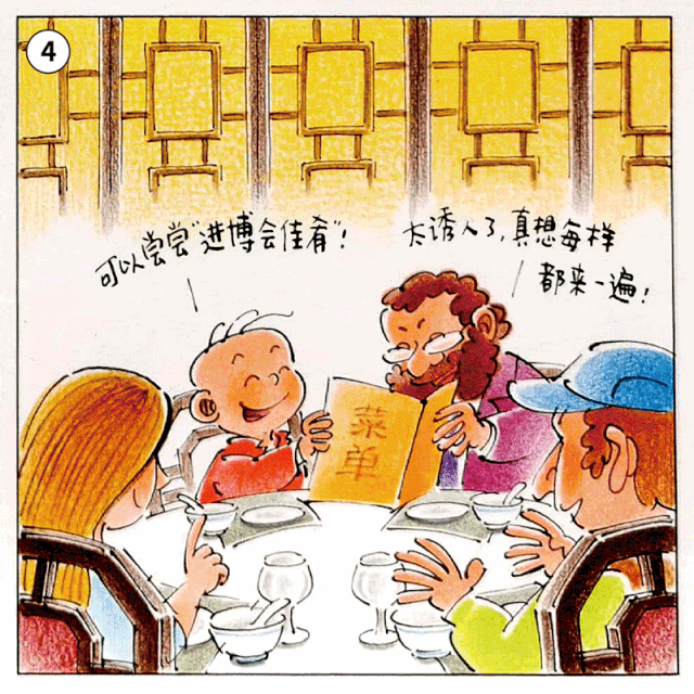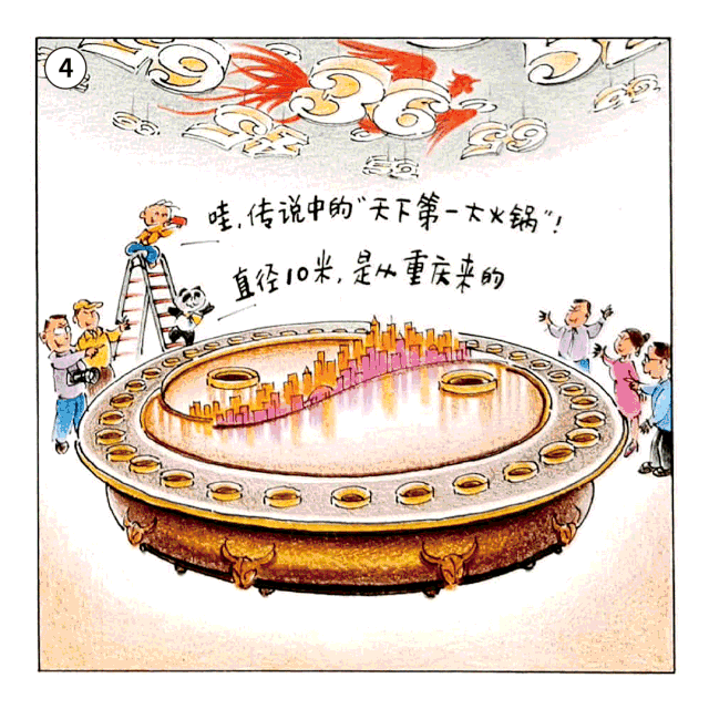 说起非物质文化遗产,进宝可是滔滔不绝:在中央广场的全景舞台,三毛你可以欣赏四川的阆中皮影戏、上海的《牡丹亭》选段、福建的南音曲艺。要体验上海的石库门生活?三毛你可以在“上海人家”尝一口蝴蝶酥还有大白兔奶糖和法式牛轧糖。北广场似乎飘来阵阵麻辣鲜香?那是重庆的“天下第一大火锅”来了,直径10米,大锅外沿有56个鼎状小锅,可同时容纳56人就餐。三毛好想马上尝一口麻辣酸爽。