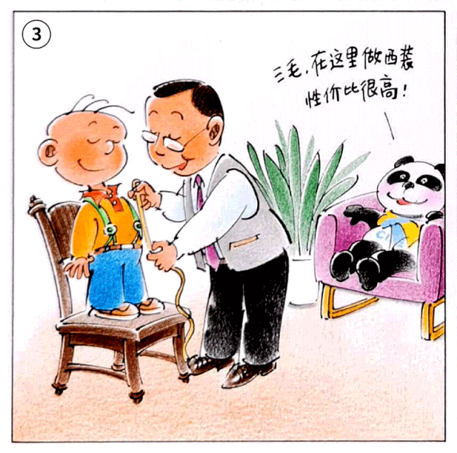 三毛摸着成卷的来自欧洲的高级面料,挑花了眼。造型师来帮忙,为他量体裁衣,面料、颜色、纽扣、装饰都一一选好。