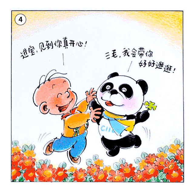 “三毛,你来啦!”进博会吉祥物“进宝”热情地挽起三毛的手:“就让我带你看看进博会吧,在新时代共享未来!”