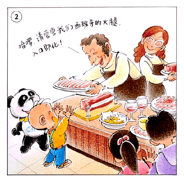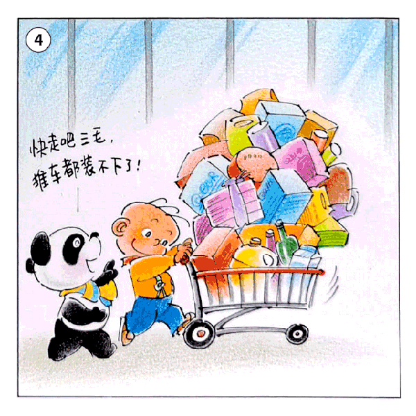 这时,一阵阵香味飘过来,三毛立刻被吸引了,原来是从人头攒动的食品健康馆传来的:澳大利亚牛排现煎、北海道寿司与西班牙火腿免费试吃,三毛挨个儿尝过之后赞不绝口。还有厄瓜多尔白虾、法国干红葡萄酒、牙买加咖啡……再加上“买一送一”的促销手段,三毛买得停不下来,购物车都快装不下啦!