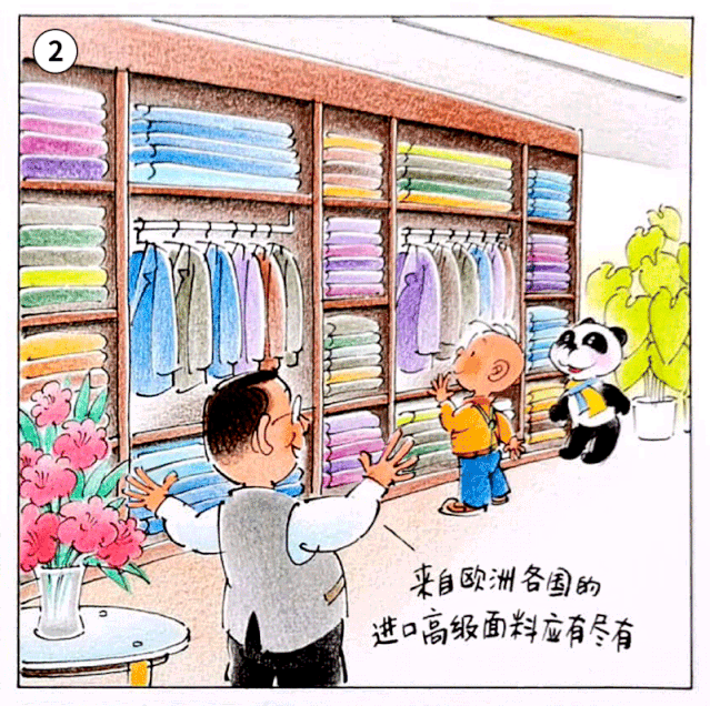 一周后,三毛再次来到店里,新西装已经做好啦!三毛穿上新衣,神采奕奕。“你就穿着这套西装参加进博会吧!”进宝拍手说道。