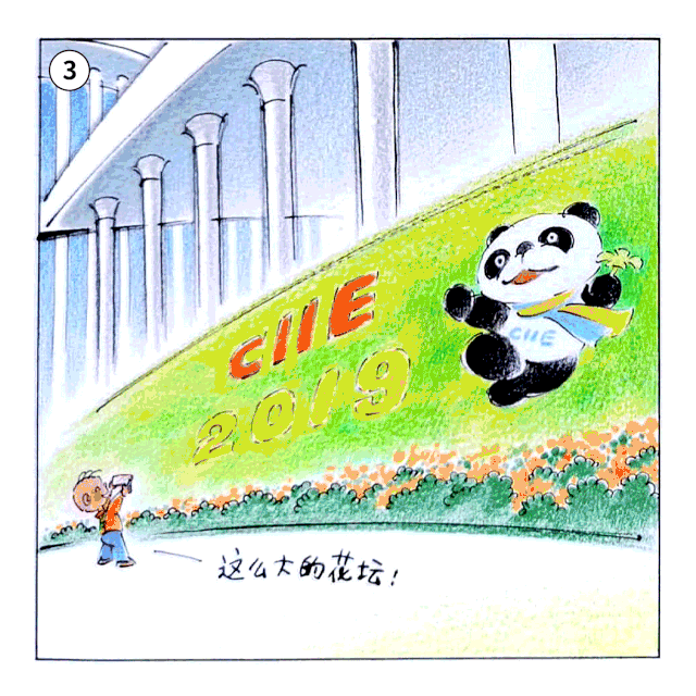 南广场上旗帜招展、花海缤纷,憨态可掬的熊猫“进宝”盛装打扮,绿植花卉拼出的“CIIE”和“2019”字样,两旁浅绿色的小叶黄杨和深绿色的直立冬青组成了迎宾彩带。