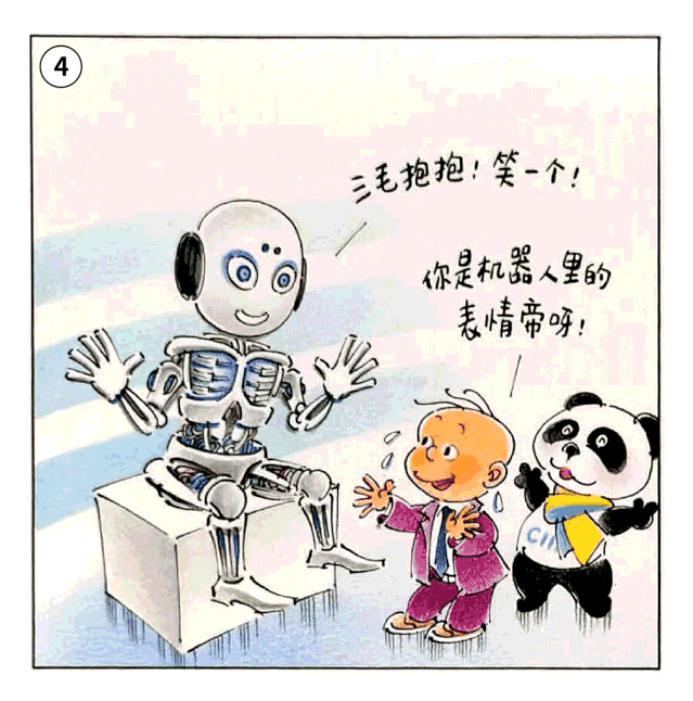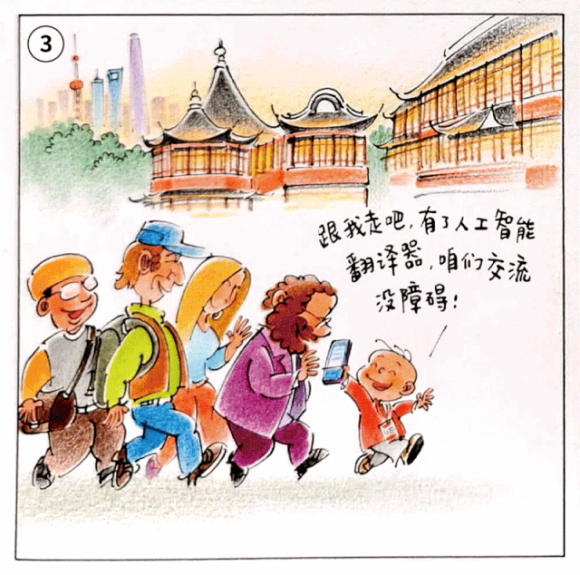 面对各国来宾的“南腔北调”,三毛不慌不忙掏出秘密武器——人工智能翻译机,英日韩法西德葡58种语言尽在掌握之中。