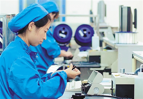 近日,民营智能制造高科技企业江苏南通中天科技集团的研发人员正在专心致志进行光纤检测。叶振华摄