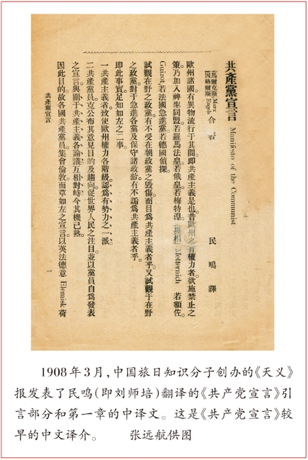 一本书影响了一代又一代人,一代又一代人改变了中国的命运、中华民族的命运。1899年,马克思恩格斯的名字以及《共产党宣言》的一些思想传入中国。1917年十月革命胜利,进一步推动了马克思主义在中国的广泛传播。1920年,北京、上海的共产主义小组分别组织了《共产党宣言》的翻译工作;8月,由陈望道翻译的第一个中文全译本《共产党宣言》在上海出版。一年之后,中国共产党应运而生。中国共产党一经成立,就把实现共产主义作为党的最高理想,确立起“为中国人民谋幸福、为中华民族谋复兴”的初心使命,团结带领人民走出了一条实现民族伟大复兴的金光大道。