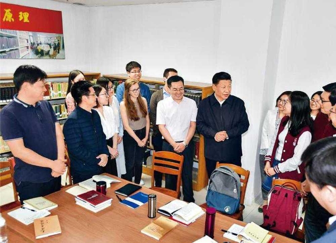 2018年5月2日,中共中央总书记、国家主席、中央军委主席习近平来到北京大学考察。这是习近平在北京大学马克思主义学院,与正在就“解读新时代”进行座谈交流的中外学生亲切交谈。 新华社记者 李涛摄
