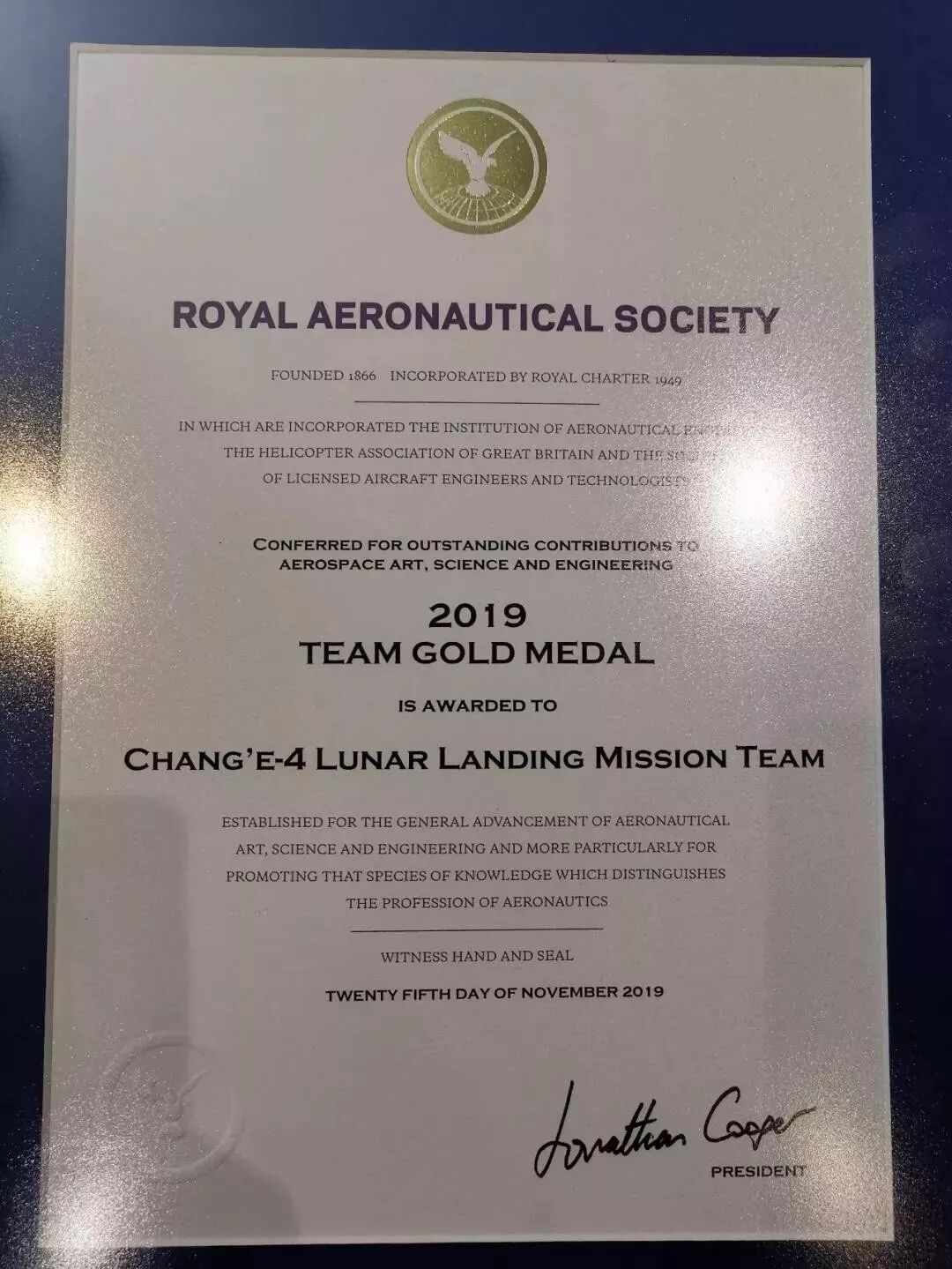 25日,英国皇家航空学会2019年度颁奖典礼在英国伦敦举行。嫦娥四号任务团队获得本年度全球唯一的团队金奖,该奖也是英国皇家航空学会成立153年来首次向中国项目颁发的奖项。