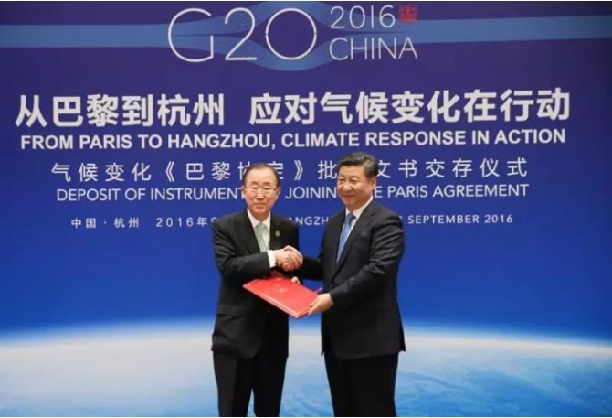 △2016年,习近平向潘基文交存中国气候变化《巴黎协定》批准文书。