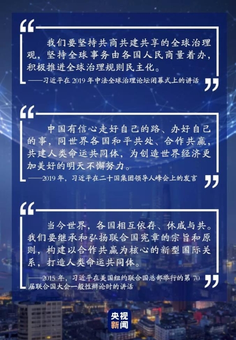 “让和平的薪火代代相传,让发展的动力源源不断,让文明的光芒熠熠生辉,是各国人民的期待,也是我们这一代政治家应有的担当。中国方案是:构建人类命运共同体,实现共赢共享。”习近平主席2017年在联合国日内瓦总部的演讲,赢得国际社会广泛赞誉。
