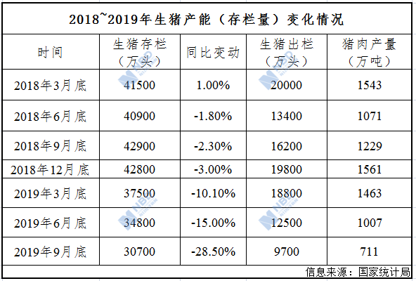 来自国家统计局的数据显示,截至2018年3月底、6月底、9月底、12月底,生猪存栏数量分别为:4.15亿头、4.09亿头、4.29亿头、4.28亿头,同比变化波动在-3.0%~1.0%之间。而进入2019年后,波动的幅度在快速增加,截至2019年3月底、6月底、9月底生猪存栏数量分别为:3.75亿头、3.48亿头、3.07亿头,同比变化分比为:-10.1%、-15.0%、-28.5%。