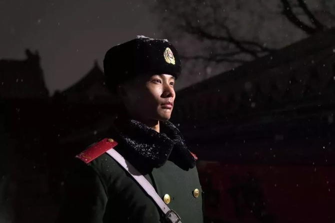 当众人都忙着拍照赏雪时武警北京总队执勤第一支队即将退伍的老兵们顶风冒雪走上哨位站上了军旅生涯中的最后一班岗