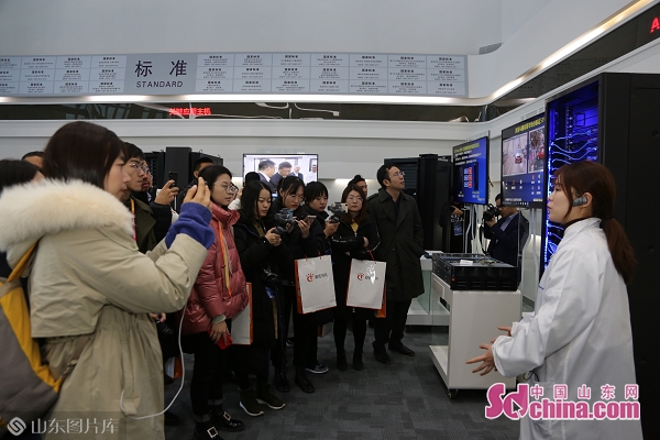 在浪潮展厅,工作人员向采访团详细介绍了浪潮高端容错计算机天梭K1、天梭M13,AI服务器等硬科技产品,以及浪潮云、爱城市网、一贷通、质量链和工业互联网等数字经济创新应用。