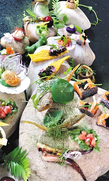 餐碟之上,鹅卵石错落有致地铺出路来,石间、石上,绿荫丛生花卉绽放,一派生机盎然,将餐桌边上的食客瞬间带至春暖花开的郊外——这是“山林”这道菜的摆盘设计,邱琼用可食用真花入馔,洋葱卷、青瓜块、藏红花丝、鱼子酱、鱿鱼须、煎炸过的小河鱼,都成了这石路上的景致,成了“绿荫花丛”。女性厨师的细腻、对美的精准把握,对自然界的观察力及发现力,在菜肴设计中得到巧妙的展现。(广州日报 全媒体记者曾繁莹 王维宣 部分图片由受访者提供)