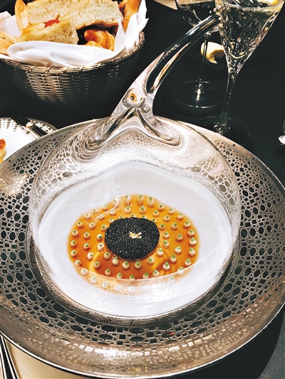 这道名菜由众多圆点“铸”成,盛放于圆形的餐盘中。总厨Julien在鱼子酱之间放上一朵黄色的食用花,打破了黑点的“沉”,唤醒了食客的视觉。最大的圆是海鲜冻,最小的圆是鱼子酱。以鱼子酱为核心,一圈一圈的圆点组合成“光圈”向外散发。这是一道视觉与味觉双重享受的经典冷盘美食,它的摆盘至少要花上厨师半个小时。我们还可以在其他的菜品中看到同样的圆点设计,比如鲜嫩番茄蟹肉千层。Julien用番茄啫喱营造出宁静的圆形湖面,用欧芹忌廉勾勒出精美的周边,每一粒的圆点都几乎大小均匀,间隔等距,谁能料想到,这竟是厨师亲手布局出来的,而非假借机器。