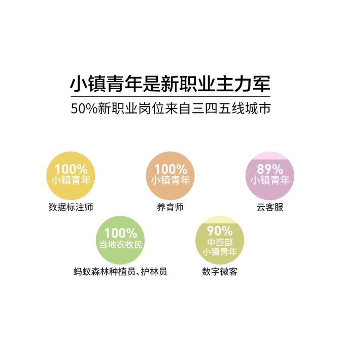 其次,新职业从业者中,约一半生活在三四五线市县。如支付宝云客服,2-5线城市人数占比88.5%,数据标注师几乎全是小镇青年。