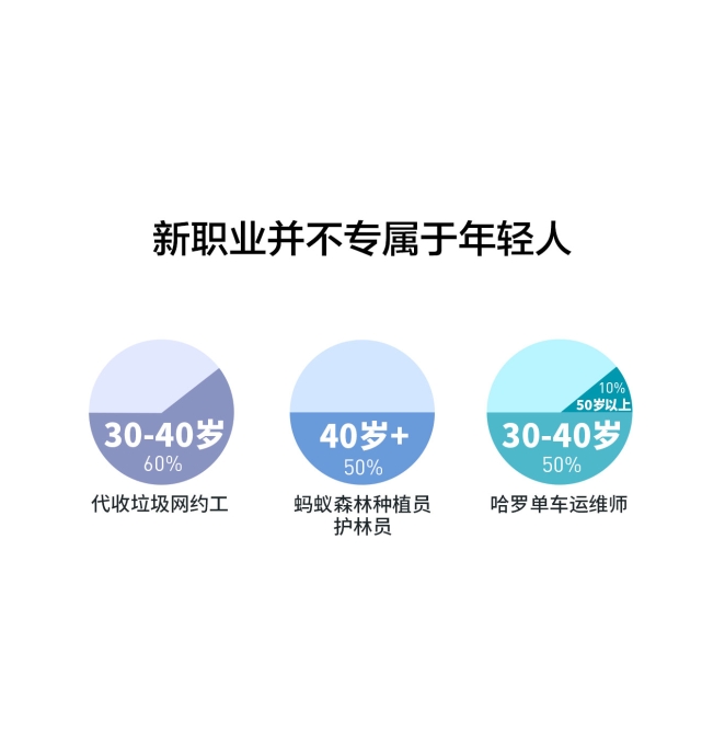 此外,新职业并不意味着年轻人的专属。为蚂蚁森林用户在内蒙古、甘肃等荒漠地区种下真树的18万人次种植员和护林员,全是当地牧民和农民,一半以上年龄超过四十岁。哈罗的“单车猎人”,一半年龄在30-40岁之间,还有10%年龄在50岁以上。